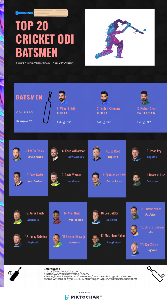 The first thing was to select a topic which was easy for me. At a glance, I got an idea that selecting “Cricket” as a theme would be a great idea. And I made an infographic on “Top 20 Cricket ODI Batsmen”. The next step was to work on research i.e. what to include or exclude in an infographic. And, to select the colors combinations based on my theme. The infographic should look clear and the viewer could be able to easily scan at a glance that what it is about. Also, to use some graphic icons in the infographic is good idea because it’s looks clear and creative at a time. As the reader is scanning, he/she should get an idea that what story infographic is trying to say. The process also includes that using more than 3 colors in it looks vague and irritative for eyes to see. The infographic should look attractive to the viewer. If any references used, it must be mentioned at the end of the infographic. This is the process of creating an infographic.